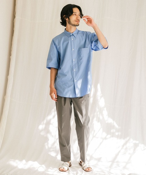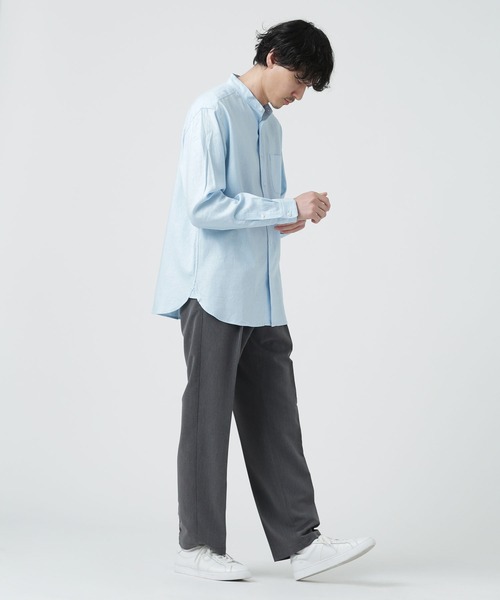 シンプルかつ洗練された印象を与えるコーデです。無地でライトブルーのバンドカラーシャツは、首元がすっきりとしており、リラックス感と上品な雰囲気を演出します。またチャコールグレーのテーパードパンツは、足首に向かって細くなるシルエットがスタイルを良く見せ、スタイリッシュな印象を与えます。色合いが落ち着いているため、普段着からビジネスカジュアルの場面まで幅広いシーンに適しています。