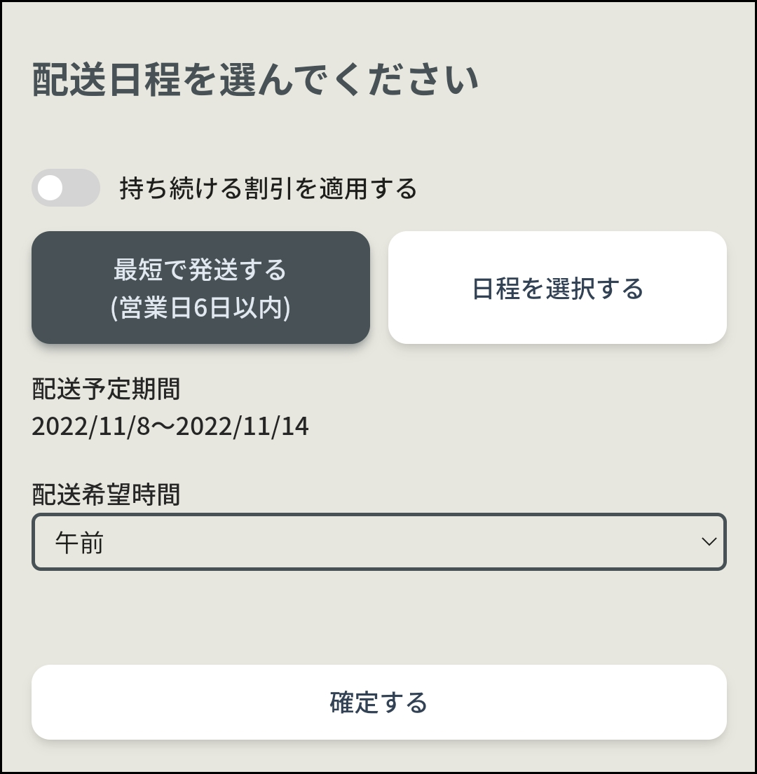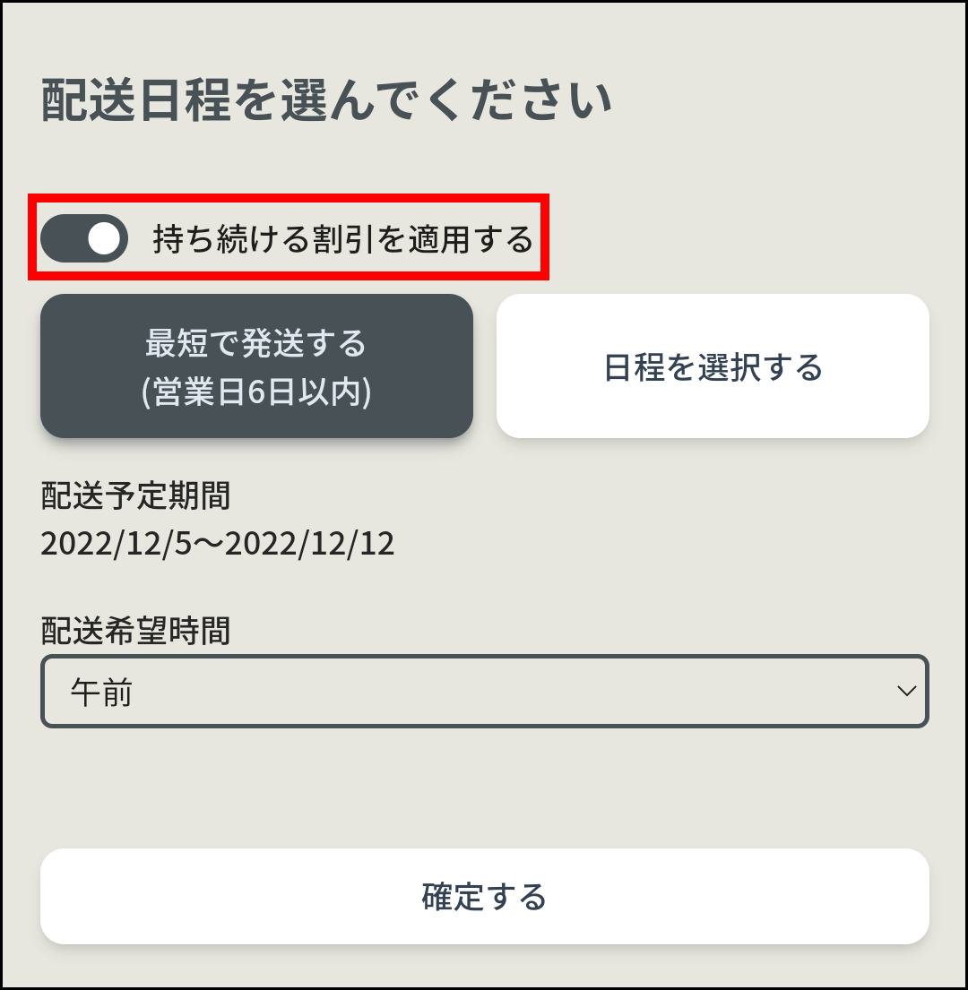 持ち続ける割引適用後の最短のお届け日をお選びいただけます。