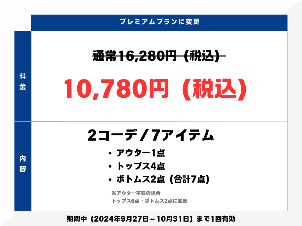 期間中に「プレミアムプラン」にアップグレードすると、通常よりもお得な料金でご利用いただけます。この機会にぜひ、季節にぴったりなファッションを楽しんでください!