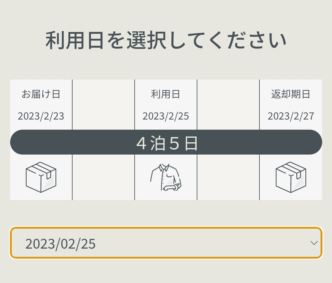コーデはイベントのご利用指定日の2日前にはお受け取りができるように発送します。返却期日はご利用指定日の2日後です。返却期日に間に合わなかった場合は延滞金が発生しますので、お気をつけください。