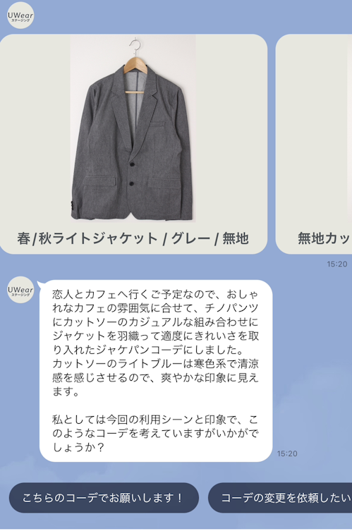 コーデで気になるところがあれば変更いたしますので、「コーデの変更を依頼したい」を選択してスタイリストへご要望をご相談ください。